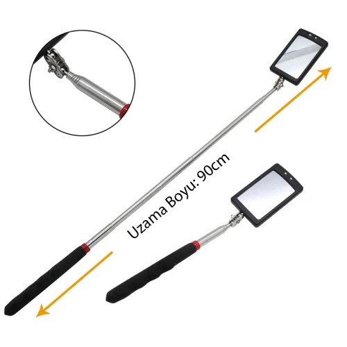 26176 Teleskopik Uzayan Katlanır Işıklı Ayna, zor erişilen alanları görüntülemek için tasarlanmış profesyonel bir muayene aracıdır. 90 cm'e kadar uzayabilen teleskopik yapısı, LED aydınlatmalı geniş ayna yüzeyi ve uzun ömürlü bataryası ile kullanıcılarına pratik çözümler sunar. Katlanabilir tasarımı sayesinde kolay taşınabilir ve saklanabilir özelliktedir.