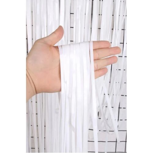 Parti organizasyonlarınızda ​sadece kapı değil duvar, perde gibi alanları da süsleyebileceğiniz Işıltılı Beyaz Püsküllü Perde.